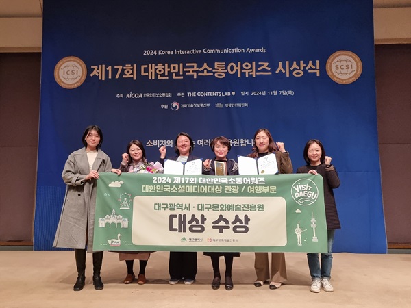 대구시와 (재)대구문화예술진흥원(원장 박순태) 관광본부는 7일 한국인터넷소통협회 주최, 과학기술정보통신부 후원의 ‘제17회 대한민국소통어워즈’에서 2024 대한민국소셜미디어대상을 수상했다.