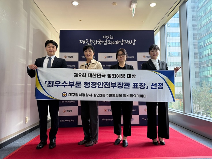 대구달서경찰서(범죄예방대응과)는 30일 서울 마포구 중앙일보홀에서 열린 ‘제9회 대한민국 범죄예방대상’에서 CPTED 부문 최우수(행정안전부장관 표창)에 선정됐다고 밝혔다.