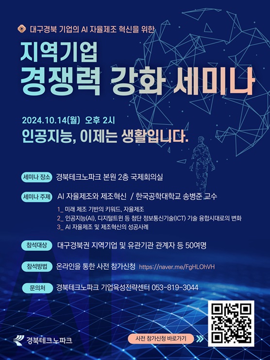 AI 자율제조 분야에 관심 있는 기업 및 기관은 누구나 참여 가능하며, 사전 신청은 세미나 포스터 하단의 QR코드를 통해 접수할 수 있다.