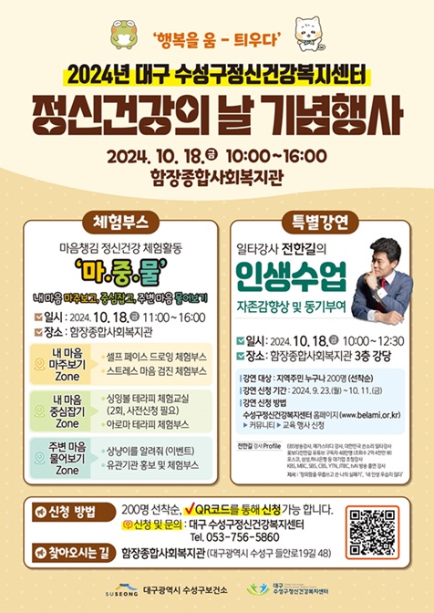 대구 수성구정신건강복지센터는 오는 18일 함장종합사회복지관 일원에서 ‘2024년 정신건강의 날 기념 행사’를 개최한다.