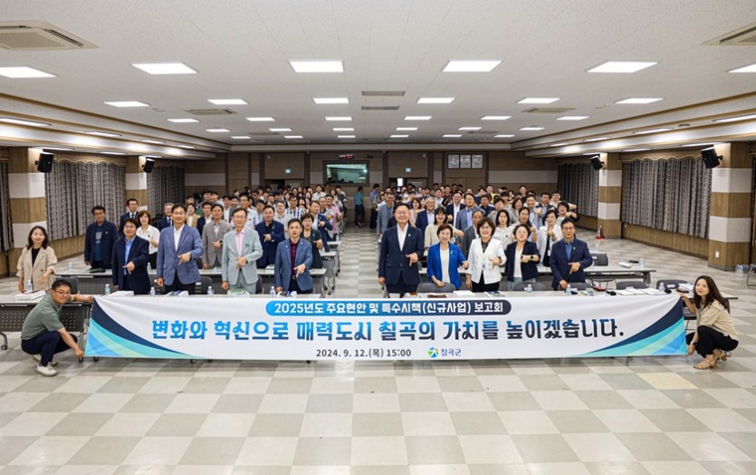 칠곡군은 최근 군청 강당에서 6급 팀장 이상 200여 명이 참석한 가운데 ‘2025년 주요현안 및 특수시책 보고회’를 개최했다.