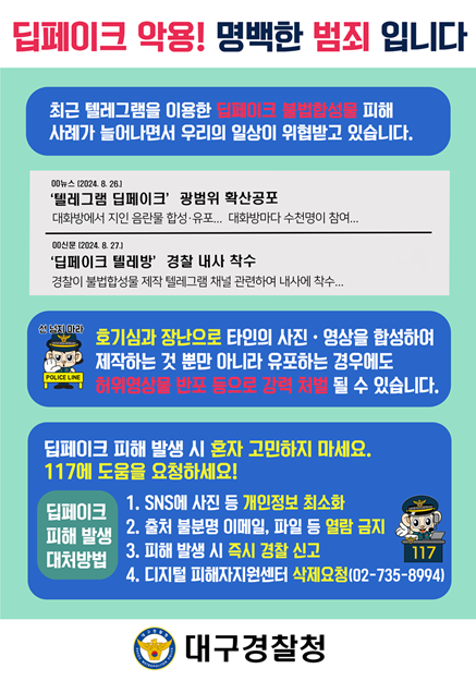 한편 대구경찰청 관계자는 "딥페이크 성범죄는 피해자의 인격을 말살하는 중대한 범죄"라며, "호기심이나 장난으로라도 딥페이크를 이용해 합성물 등을 제작하거나 유포할 경우 형사처벌될 수 있다"고 강조했다.