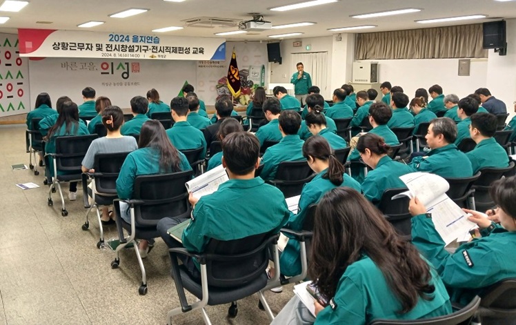 이날 교육은 을지연습 주요내용, 연습기구 편성, 반별 임무, 사건메시지 처리방법 등 각 분야별 업무를 숙지하고 점검하는 순서로 진행됐으며 올해는 연습 기간 전 임무카드를 사전 배포하여 근무자들이 원활한 훈련대응을 할 수 있도록 지원했다.