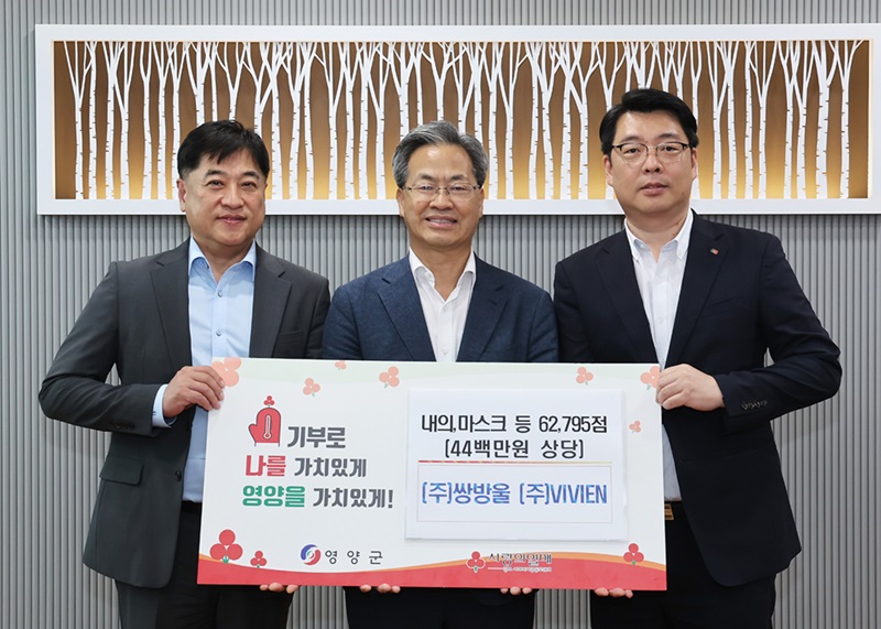 (주)쌍방울과 (주)비비안은 8일 영양군을 방문해 사회복지시설 및 독거노인 등의 건강한 여름나기를 지원하기 위해 내의, 팔토시, 마스크 등 4천4백만원 상당의 물품을 기부했다.