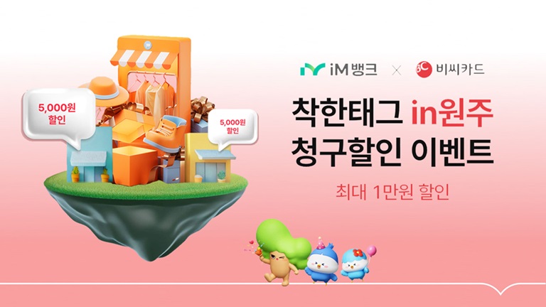 iM뱅크 앱의 이벤트 페이지에서 '착한태그 in 원주'에 참여한 후, 원주 지역 내 가맹점에서 1만원 이상 결제 시 5천원의 청구 할인을 받을 수 있다.