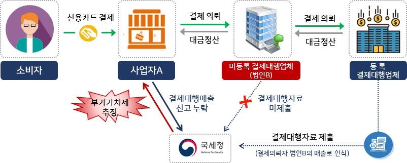 특히, 미등록 결제대행업체를 이용한 혐의가 있는 가맹점에 대해서는 부가가치세 신고내용을 정기적으로 확인하고 있으며 부가가치세 성실신고를 유도하고, 불법 결제대행업체의 이용을 방지한다.