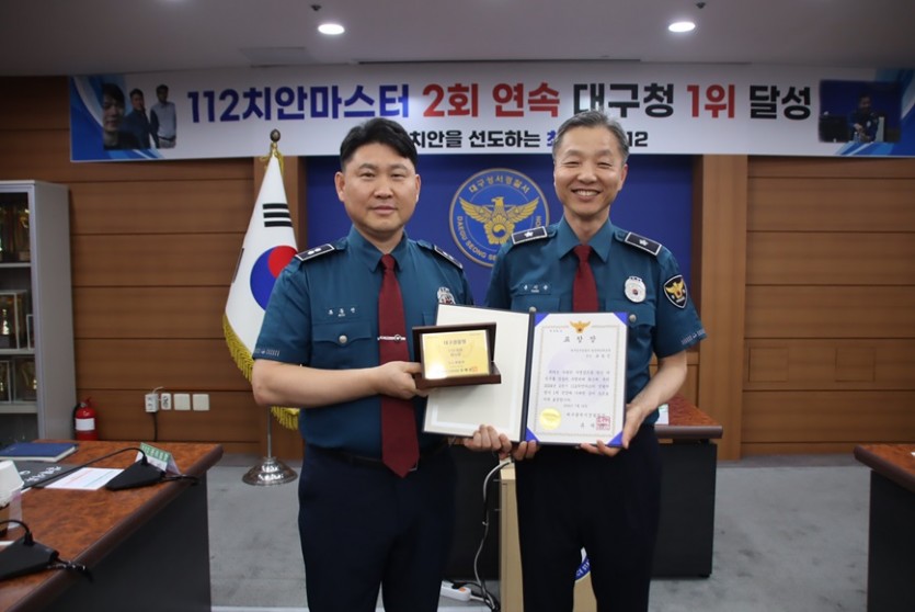'112 치안 마스터'는 112 신고 접수 및 처리 능력이 뛰어난 경찰관을 선정하는 제도로 대구경찰청 112 치안종합상황실의 장문기 경위와 성서경찰서의 류동선 경감이 각각 1위로 선발돼 개인 인증패와 표창장을 수여받았다.