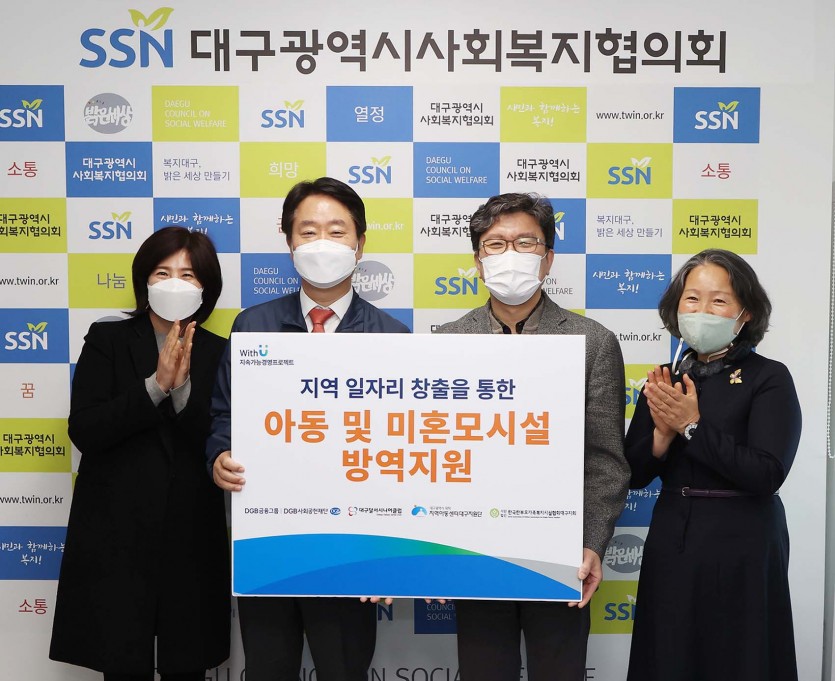 이 날 전달식에는 최태곤 DGB금융그룹 전무, 이승희 지역아동센터대구지원단장, 박진필 대구달서시니어클럽 관장, 이윤숙 가톨릭푸름터 원장이 참석해 면역력이 취약해 건강한 생활환경 제공이 중요한 지역 아동과 미혼모를 위한 방역 지원에 대한 계획을 설명하고 원활한 사업진행을 위해 힘을 모았다.
