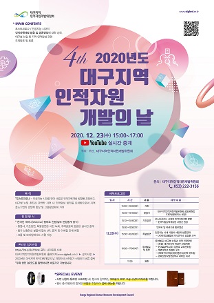 대구지역인적자원개발위원회(설치기관:대구상공회의소)가 주최·주관하는 "2020년 대구지역 인적자원개발의 날"이 오는 23일 유튜브 온라인 생중계로 개최된다.