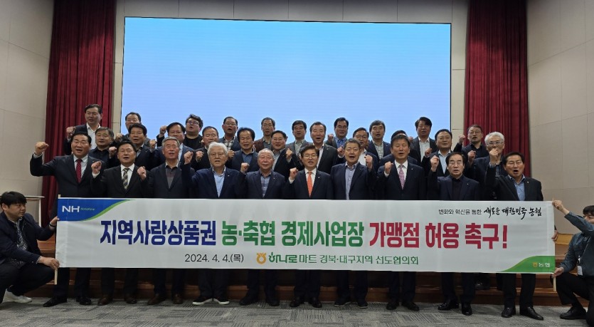 농협 하나로마트 경북대구지역 선도조합협의회(회장 이달호 예천농협 조합장)는 4일 농협 경북본부 대강당에서 2024년 정기총회 농축협 하나로마트 등 경제사업장의 지역사랑상품권 가맹점을 허용할 것을 촉구하는 결의대회를 개최했다.