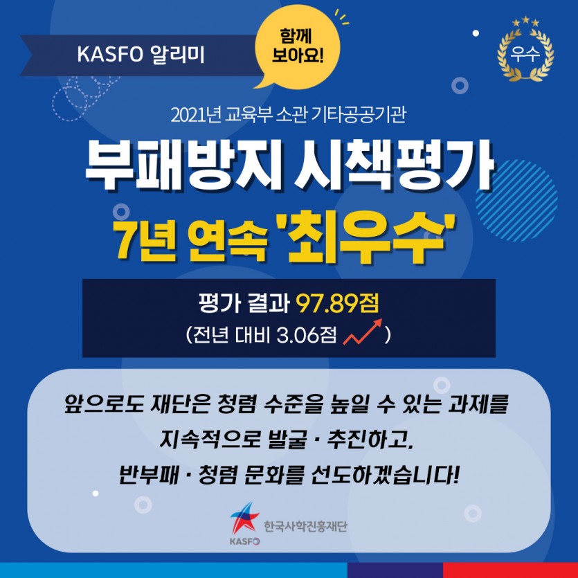 2021년 교육부 산하기관 부패방지 시책평가서 최우수 기관 선정,