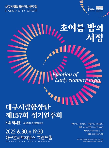 대구시립합창단 제157회 정기연주회 ‘초여름밤의 서정(Emotion of Early Summer Night)’을 오는 30일 목요일 오후 7시 30분 대구콘서트하우스 그랜드홀 무대에서 박지운 상임지휘자의 지휘로 연주한다.