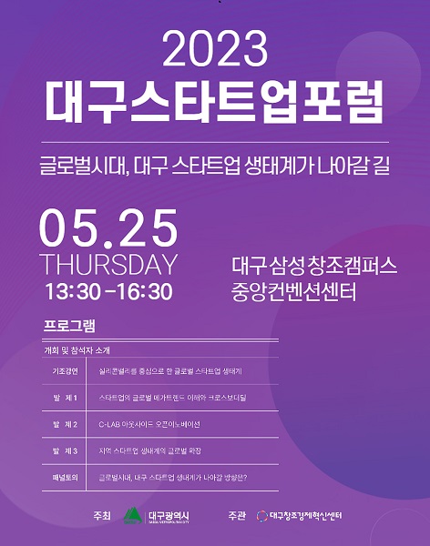 시는  대구창조경제혁신센터와 함께 ‘글로벌시대, 대구 스타트업 생태계가 나아갈 길’이라는 주제로 대구 스타트업 포럼을 25일 대구삼성창조캠퍼스 중앙컨벤션센터에서 개최한다고 밝혔다.