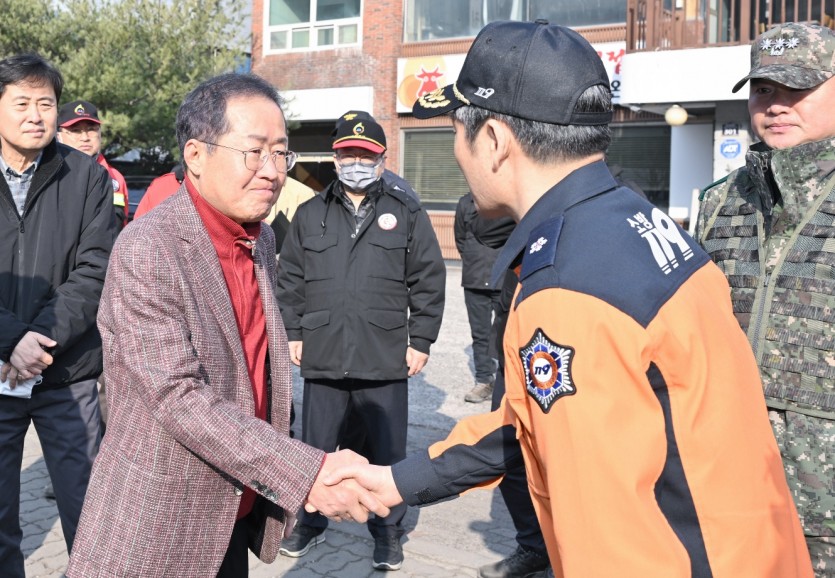 홍준표 대구시장 "앞산 산불진화 지원"한 관계기관 격려 > 대구