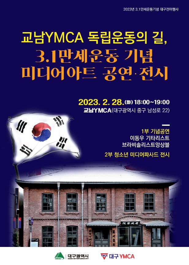 대구시는 비폭력 평화운동이었던 3.1운동을 기억하고, 대구3·8만세운동의 거점인 교남YMCA의 역사적 의미를 되새기는 3·1만세운동 기념 전야행사를 28일 교남YMCA회관에서 개최한다고 밝혔다.