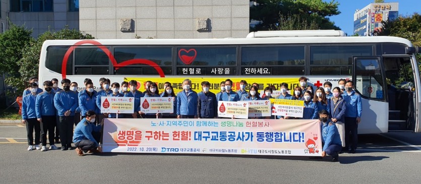 대구교통공사는 코로나19 장기화로 인한 혈액 수급 위기극복을 위해 20일 상인동 본사와 3개 차량기지사업소(월배․문양․칠곡경전철)에서 노․사 및 지역주민과 함께 생명나눔 헌혈행사를 가졌다고 21일 밝혔다.