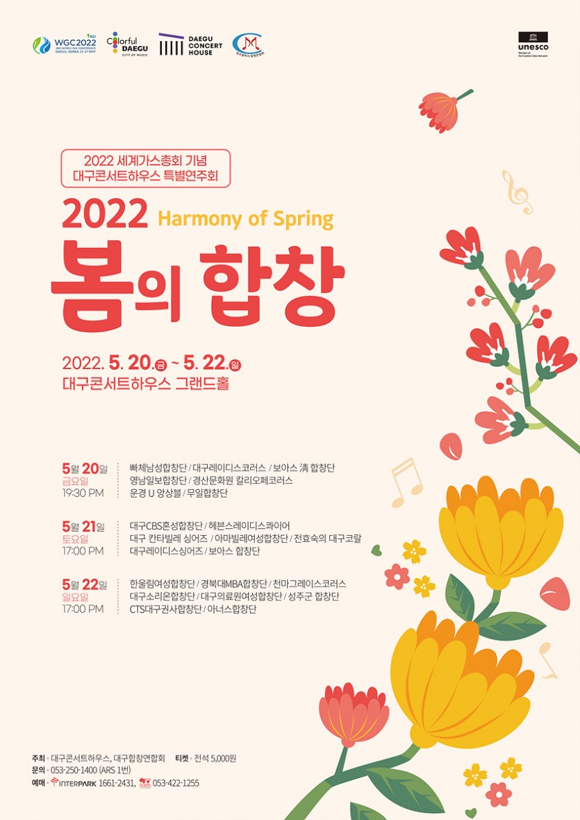 대구콘서트하우스와 대구합창연합회가 공동으로 주최하는 ‘2022 봄의 합창’은 우리가 즐겨 부르고 사랑해온 다양한 가곡들을 지역 아마추어 합창단들의 열정의 무대로 만나볼 수 있는 시간이다.
