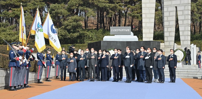 김부겸 국무총리는 28일 제62회 '2.28 민주운동기념일'을 맞이해 대구문화예술회관에서 기념식 행사를 마친 후 황기철 보훈처장, 오영식 국무총리 비서실장등과 함께 신암선열공원 단충사에서 참배했다.