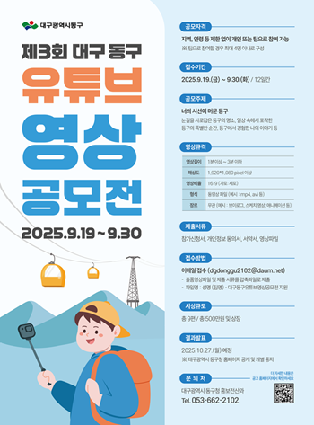 공모전은 지역과 연령 제한 없이 누구나 참여할 수 있으며, 개인 또는 팀(최대 4인)으로 응모 가능하다. 1분 이상 3분 이하 분량의 영상으로, 동구의 명소나 일상, 경험담 등을 담으면 된다.