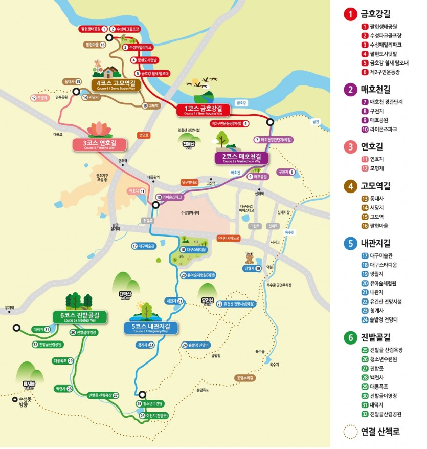 수성구는 진밭골의 깨끗한 환경을 많은 주민들이 접할 수 있도록 단절된 숲속 산책로 구간을 연결하는 공사를 해 진밭골의 자연환경을 배경으로 걷고 휴식할 수 있는 ‘생각을 담는 길 6코스인 진밭골길’을 새롭게 조성한 것이다.