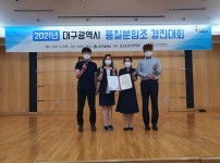 사회적 가치창출 부문 ‘우수상’ - 두류수영장 ‘두류수비대’ 분임조대구시설공단은 지난 3일 대구 엑스코에서 개최된 ‘2021년 대구시 품질분임조 경진대회’에 4팀이 출전해 우수상(2팀), 장려상(2팀)을 수상했다. 대구시가 주최하고 한국표준협회가 주관하는 품질분임조 경진대회는 기업의 현장업무 개선활동을 통해 생산성 향상, 품질개선, 고객만족도 제고 등에서 우수한 성과를 거둔 분임조의 우수사례를 발굴하고 공유하는 자리이다.이번 대회는 12개 부문 22개팀이 참가했으며 사회적 가치창출 부문과 서비스 부문에서 우수상을 수상한 ‘…