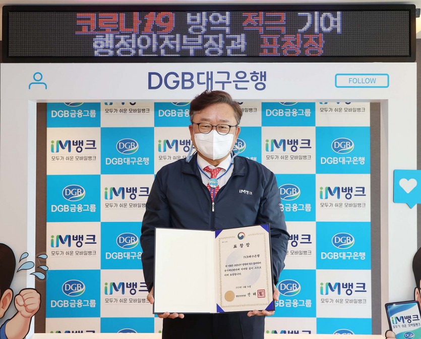 DGB대구은행(이하 대구은행)은 코로나19 재난 방역 적극 참여 및 지역사회 지원활동을 통한 사회적 가치 구현에 기여한 공을 인정받아 ‘2021년 코로나19 대응 유공 표창’ 을 수상했다고 밝혔다