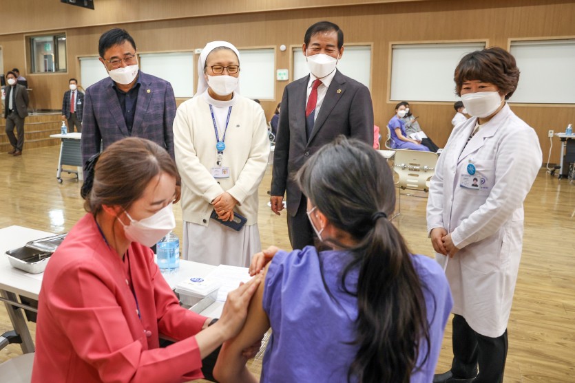 이날 장상수 의장과 김재우 의원은 지난 4일부터 시작된 고위험 의료기관 종사자에 대한 아스트라제네카 백신 접종이 한창인 파티마 병원을 찾아, 병원 대외협력실장의 현장 설명을 들은 뒤, 김선미 병원장과 함께 접종 현장을 둘러보며 현장의 어려움을 듣고 공감하면서 개선방향을 함께 고민하는 시간을 가졌다.