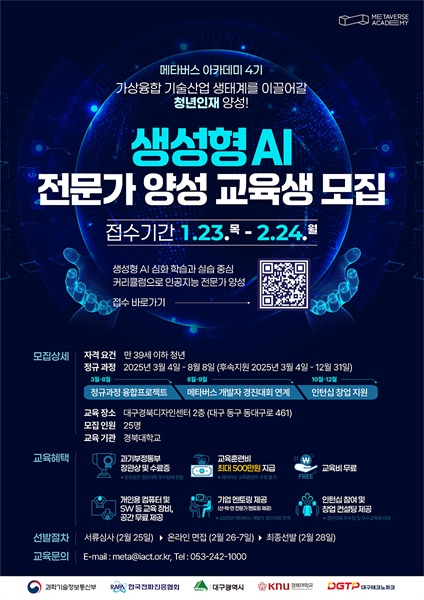 대구시는 경북대학교와 함께 2025년 동북권 메타버스아카데미 수행기관으로 선정돼 지역 청년을 대상으로 생성형 AI 교육과정을 제공한다고 지난 6일 밝혔다.
