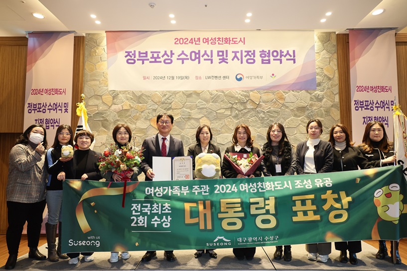 대구 수성구가 여성가족부가 주관한 ‘2024 여성친화도시 조성 사업평가’에서 우수 지자체로 선정되어 대통령상을 수상했다.
