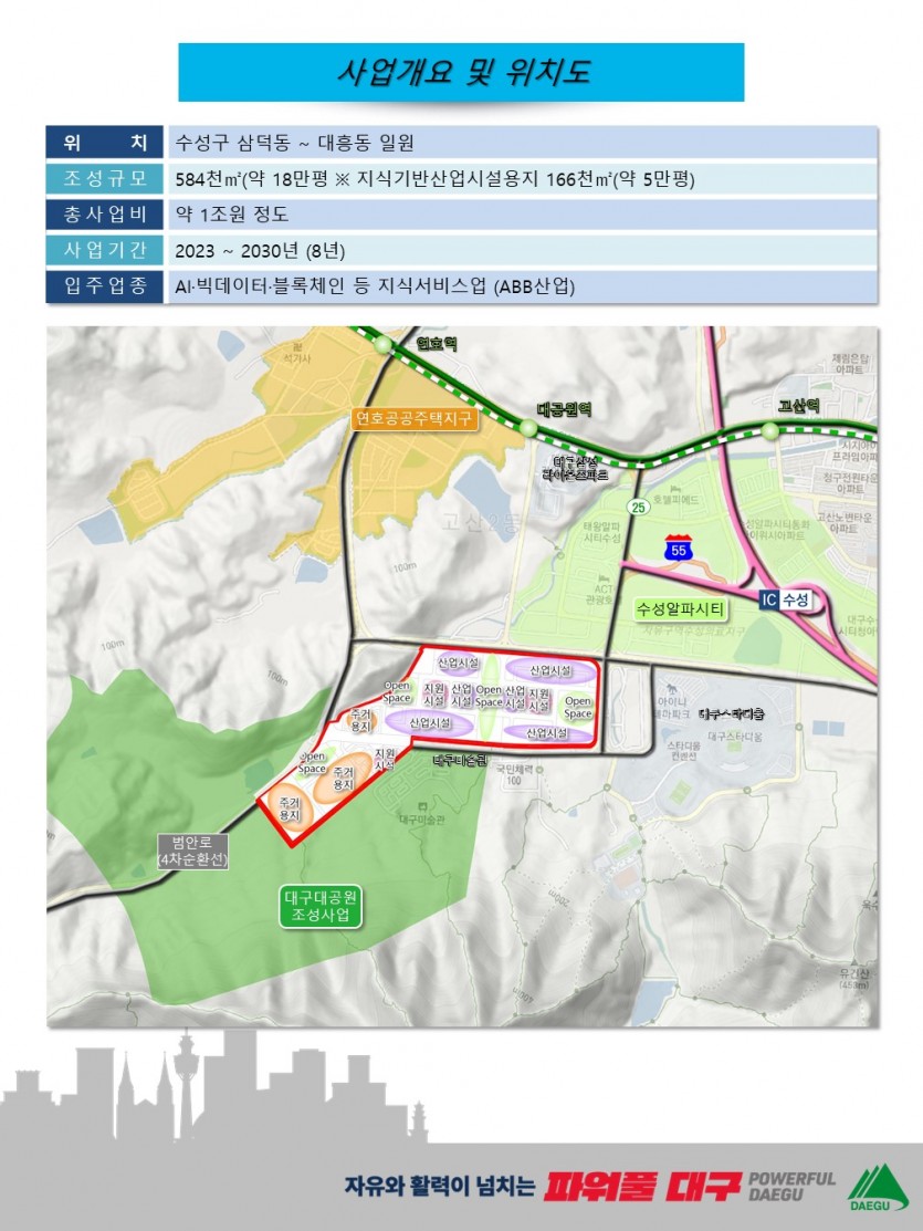 대상지는 대구미술관, 삼성라이온스파크 및 대구스타디움, 그리고 향후 대구대공원 및 연호지구 개발이 예정된 정주여건이 매우 우수한 지역으로 지역 청년 및 디지털 기업들이 선호하는 직·주·학·유가 가능한 최고의 기업환경을 제공할 예정이다.
