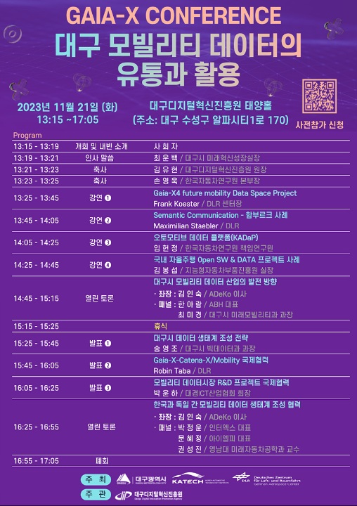 아울러 Gaia-X와 Catena-X 구축·운영에 핵심 역할을 담당하는 독일 DLR 전문가들이 한국을 방문해 파트너쉽 구축을 희망하며 대구시와 협력을 모색하기 위해 참석한다.
