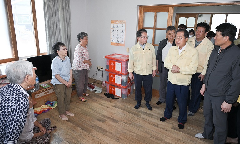 홍준표 대구시장이 11일 태풍 ‘카눈’으로 피해를 입은 군위군 효령면을 방문해 피해 상황을 확인하고 이재민을 위로했다.