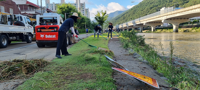 침수구간의 복구 작업은 태풍이 지나간 10일 오후 3시부터 시작됐으며, 양수기 4대, 덤프트럭 6대, 살수차 10대, 스키드로더 9대 등 총 35대의 중장비와 인력 70여 명이 투입돼 하천 범람으로 발생한 각종 부유물을 제거했다.