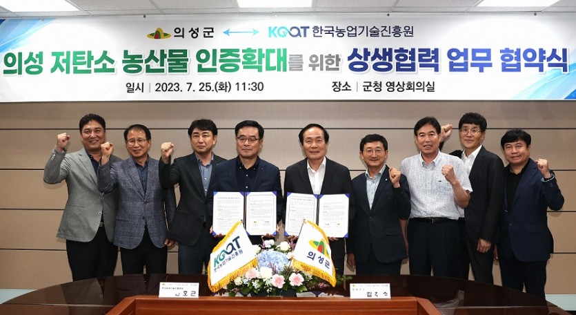 의성군은 25일 한국농업기술진흥원과 농업분야 2050 탄소중립 추진 및 저탄소 농산물 인증 확대를 위해 업무협약을 체결했다고 밝혔다.
