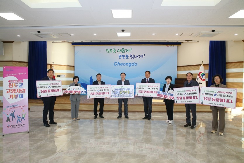 이날 청도군 행정복지국 간부공무원들은 자매결연 지역인 ▲서울 강남구 ▲경기 안산시 ▲대구 수성구 ▲대구 중구 ▲울산 남구로 고향사랑기부제의 상생·발전을 기원하는 희망의 응원 메시지 전달과 함께 기부금을 기탁했다.