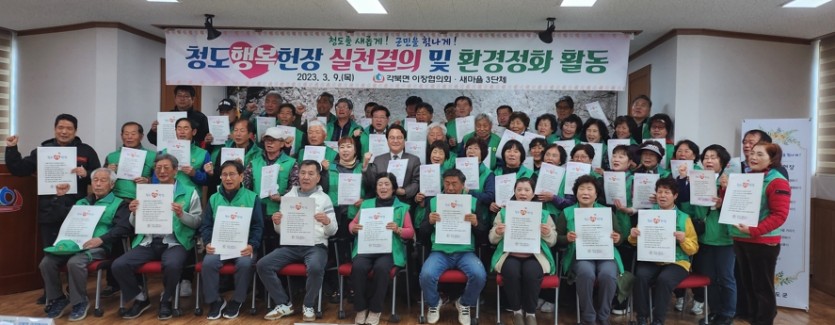 이날 결의 대회 및 환경정화활동은 김하수 군수를 비롯한 각북면 이장협의회, 새마을3단체, 기관단체와 직원 등 100여 명이 참여하였으며, 참여자 전원은 청도행복헌장을 나부터 실천할 것을 다짐하면서 각북 면장의 선창으로 청도행복헌장을 함께 낭독했다.