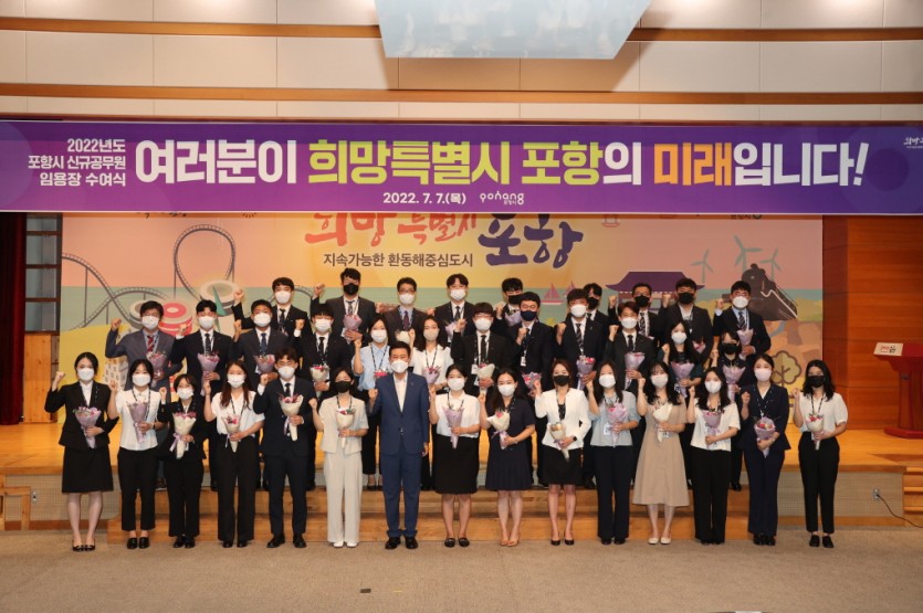 이강덕 포항시장은 “오늘 공직에 처음 발을 내디딘 여러분들의 앞날을 응원한다”며, “앞으로의 공직생활을 시민에게 봉사하는 정신과 포항시를 위하는 마음을 갖고 임해주기를 바란다”라고 당부했다.