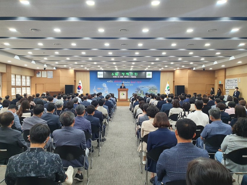 경산시는 2일 시청 대회의실에서 직원 200여 명이 참석한 가운데 6월 정례조회를 개최했다고 밝혔다.