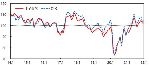 대구경북지역 소비자들의 경제상황에 대한 심리를 종합적으로 나타내는 소비자심리지수(CCSI)는 1월 중 102.4로 전월과 동일하며 가계 재정상황에 대한 인식에서 대구경북지역 소비자들의 현재생활형편CSI(89)는 전월대비 1p 하락해 생활형편전망CSI(94)도 전월과 동일하다고 밝혔다.