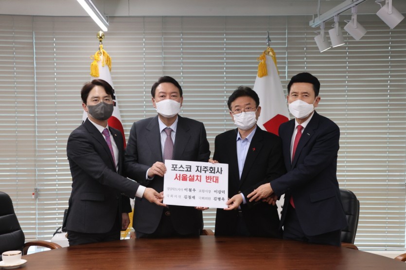 이강덕 시장과 이철우 도지사, 정해종 시의회 의장, 고우현 도의회 의장, 김정재․김병욱 국회의원은 성명서를 통해 지역균형발전에 역행하는 ‘포스코 지주회사 서울 설치’를 반대한다고 밝혔다.