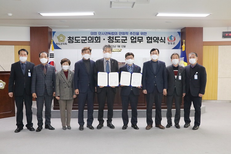 청도군의회는 지난 12일 청도군의회 본회의장에서 청도군과 인사권 독립의 안정적 추진을 위한 협약식을 체결했다고 빍혔다.