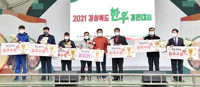 부문별 최우수상으로 암송아지부문에 상주 김인규, 미경산우부문 김천 박세균, 경산우1부 칠곡 장영상, 경산우2부 예천 우병국, 경산우3부 영주 엄정열, 고급육부문에 영천 조규수 농가가 각각 수상했으며 우수시군 부문에서는 상주시가 최우수상, 문경시가 우수상을 차지했다.
