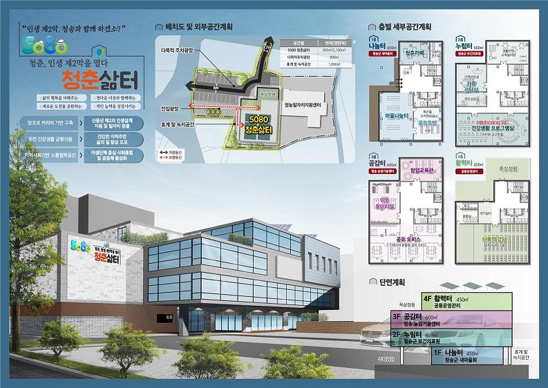 청송군 도시재생인정사업은 청송읍 금곡리일대 2,753㎡규모의 복합센터건립으로 오는 2023년까지 총사업비 83.3억 원을 투입해 건강실, 다목적강당, 소통협력시설 등 지역주민의 삶의질 향상과, 주민공동시설운영등을 통한 도시경쟁력 회복을 위하여 금번 도시재생뉴딜사업을 추진하게 됐다.