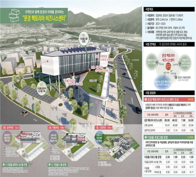 이번에 선정된 문경시 도시재생인정사업은 점촌4동 일대 3,944.5㎡규모의 비즈니스센터건립으로 2023년까지 총사업비 83.3억 원을 투입해 주변 산업단지와 배후주거지를 연계해 산단근로자 및 지역민을 위한 도서관, 복합공간 등 생활환경을 개선해 지역경쟁력을 확보할계획이다.