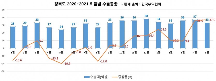 우리나라 수출이 코로나 악재를 극복하고 견조한 성장세를 보이고 있는 가운데 5월 국가 수출은 508억 달러로 전년 동기 349억 달러 대비 +45.6%의 증가세를 나타냈으며, 경북도는 지난해 9월부터 5월까지 9개월 연속 증가율을 보이면서 올해 4월과 5월에는 37억 달러와 33억 달러를 수출해 각각 36%와 37%의 증가율을 보이며 최고의 성장세를 기록했다.