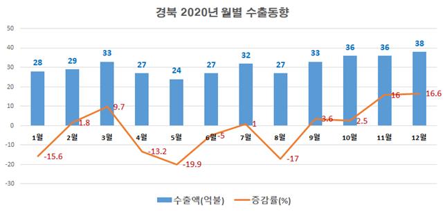경북도는 지난해 12월 수출이 전년 동기 대비 16.6% 증가한 38억 달러(약 4조 2천억원)를 기록하면서 11월에 이어 두 자릿수 증가율을 보였다.
