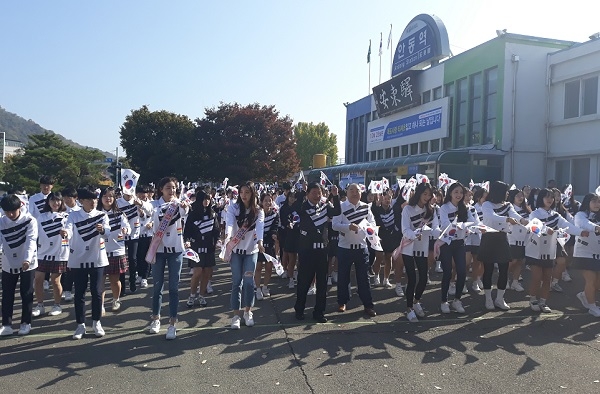 지난달 25일 경북 중‧고등학생을 포함한 700여 명의 경북도민들이 독도칙령일 118주년을 맞아 안동역 광장에서 플래시몹을 펼치며 온몸으로 독도사랑을 외쳤다.