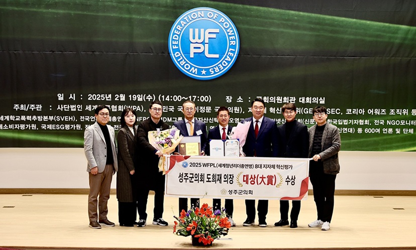 성주군의회 도희재 의장이 지난 19일 국회의원회관 대회의실에서 열린 '2025년 세계청년리더총연맹(WFPL) 8대 지자체 혁신평가 시상식'에서 최고 평점을 받아 ‘대상’을 수상했다.