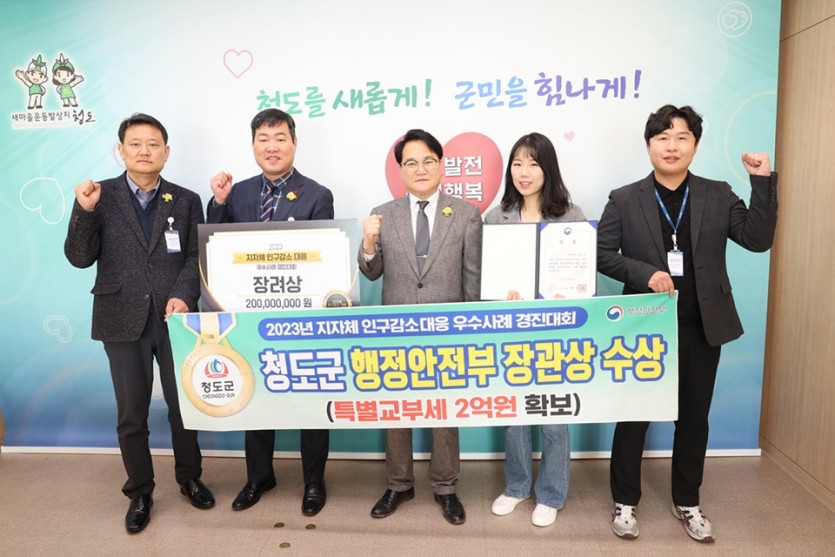 청도군은 6일 행정안전부가 주최한 '2023년 지자체 인구감소 대응 우수사례 경진대회'에서 장려상을 받아 재정 인센티브로 특별교부세 2억 원을 확보했다고 밝혔다.