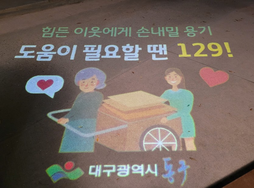 동구청은 선보인 로고젝터는 ‘힘든 이웃에게 손내밀 용기 도움이 필요할 땐 129!’로 도움이 필요한 위기가구를 찾기 위한 메시지를 담고 있다.